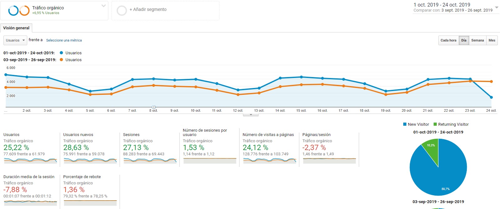 En esta captura de Analytics puedes ver cómo ha mejorado la visibilidad orgánica de la web comparando lo que llevamos de octubre con el mismo periodo de septiembre.